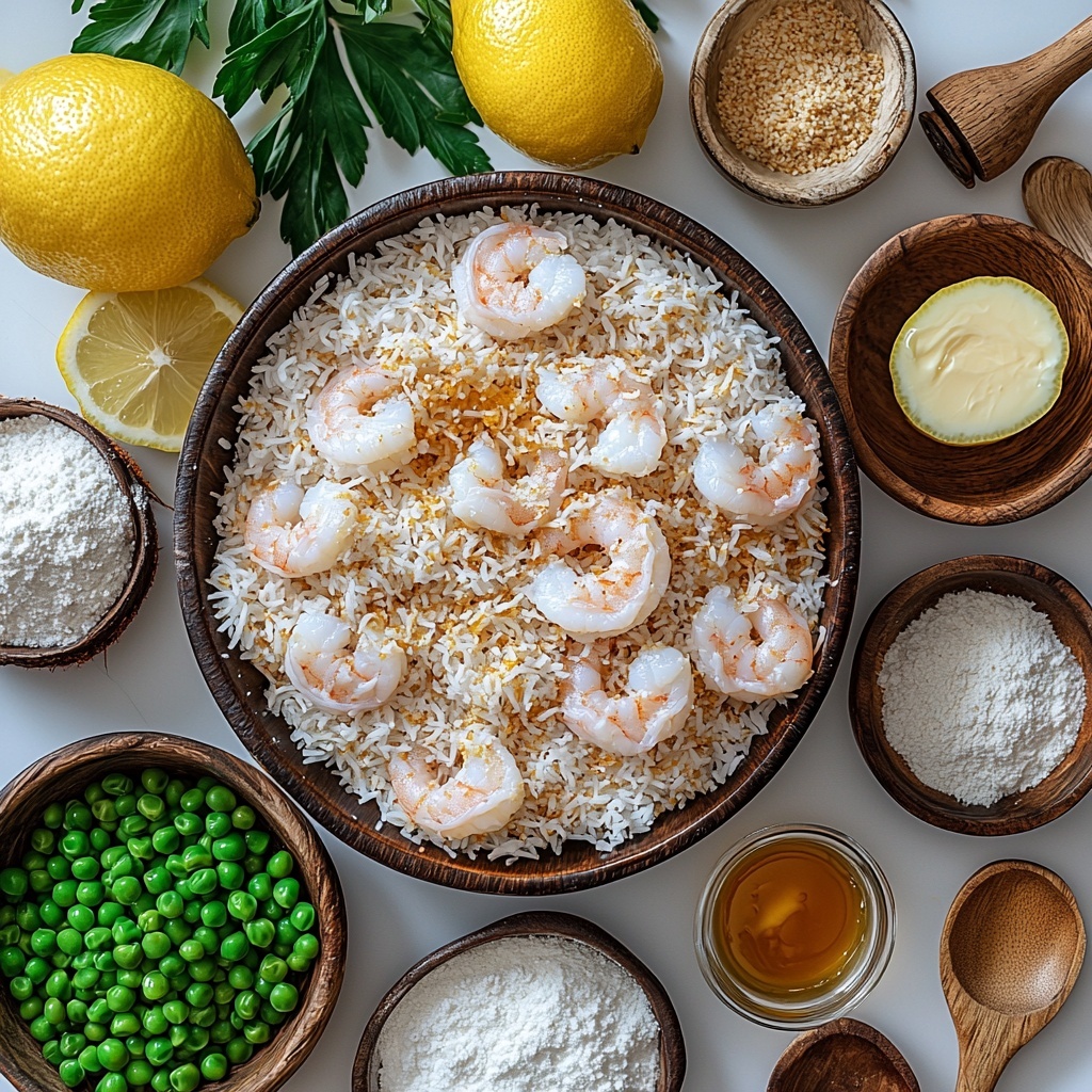 Enjoy a delicious tropical-inspired meal featuring crispy baked coconut shrimp paired with vibrant springy rice mixed with peas and zesty lemon. This easy-to-make recipe combines the natural sweetness of coconut and honey butter with tender shrimp and fluffy rice, delivering a balanced and flavorful dish perfect for any occasion.