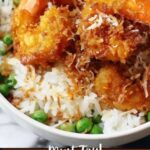 - Serve: Plate the springy rice mixed with peas and lemon, top with crispy baked coconut shrimp, and drizzle generously with the warm honey butter sauce for a perfect tropical treat.