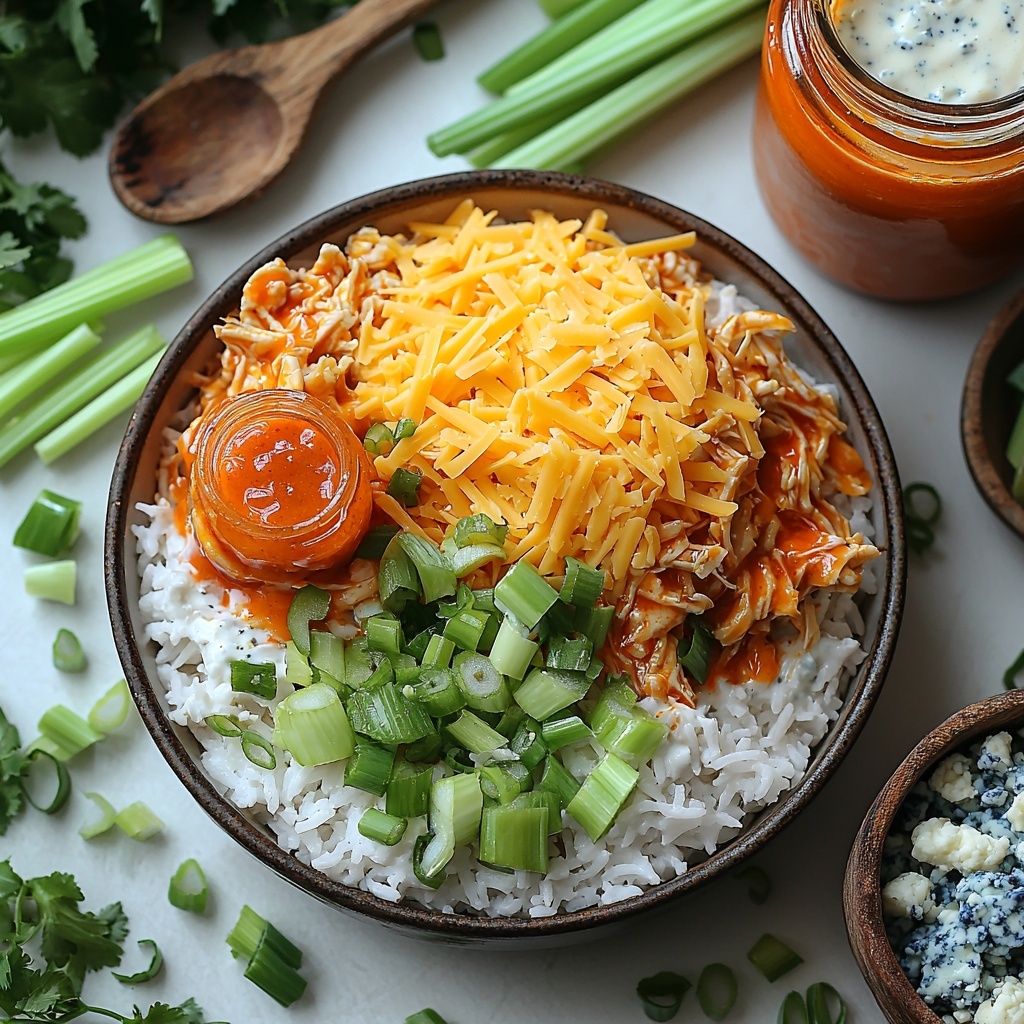 - Mix Ingredients: In a large bowl, thoroughly combine the shredded cooked chicken, buffalo sauce, ranch dressing, cooked rice, diced celery, and green onions until evenly incorporated.