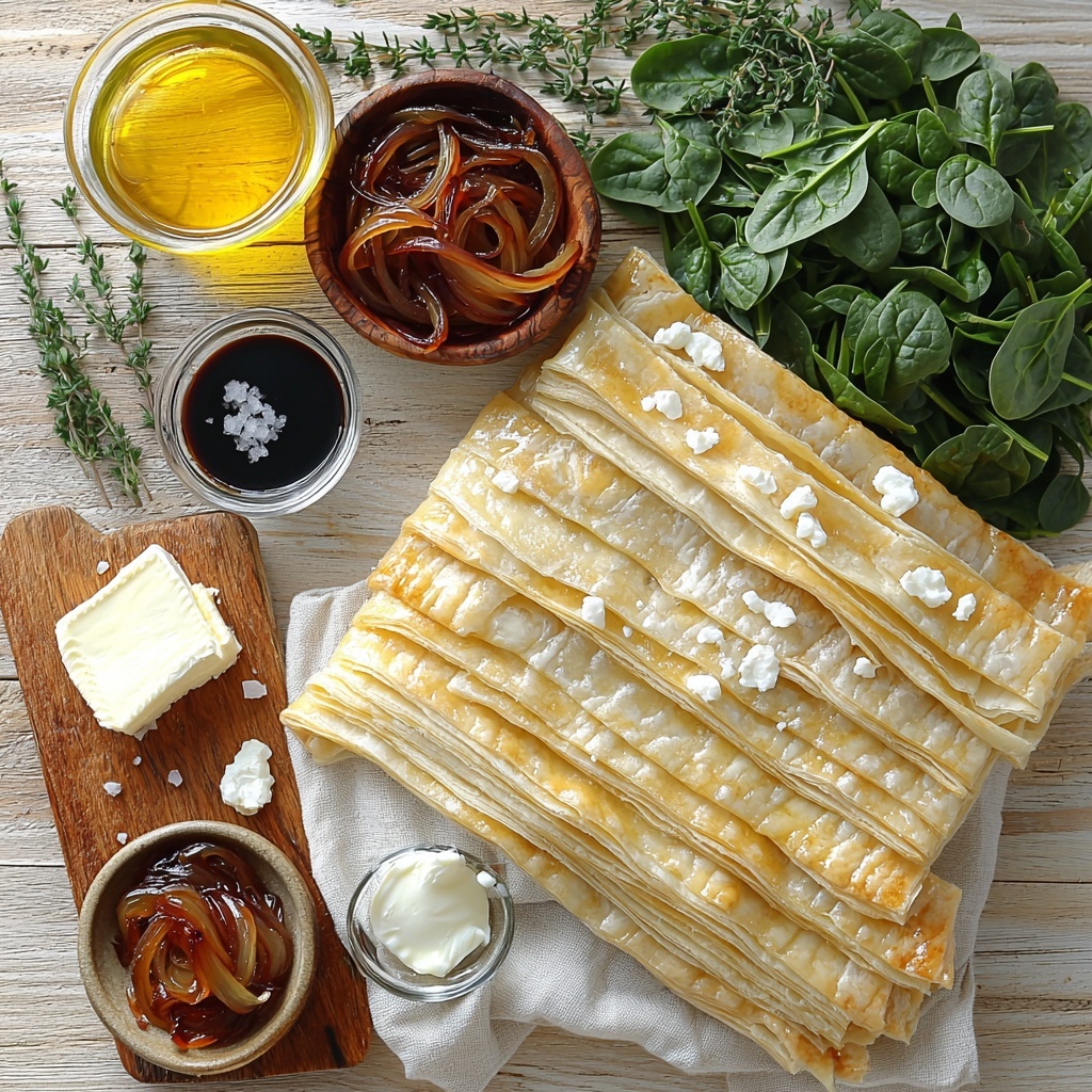 The magic behind these tarts lies in their straightforward but essential ingredients. Each element brings its own unique touch — from the flaky puff pastry that provides the perfect crispy base to the caramelized onions that offer a luscious sweetness, complemented by creamy goat cheese and fresh spinach for a burst of color and nuance.