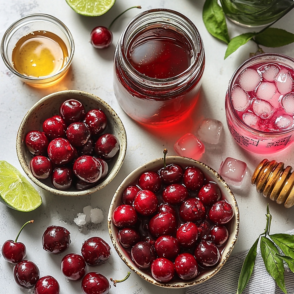 Brew 1/2 cup of hibiscus tea, being careful not to over-steep so it maintains its bright flavor without bitterness. Fill a glass with plenty of ice, then pour the brewed hibiscus tea over it. Add 3 to 4 tablespoons of your homemade cherry syrup along with 2 tablespoons of fresh lime juice. Stir or shake the mixture vigorously until well combined, and get ready to enjoy the perfect balance of sweet, tart, and floral flavors.
