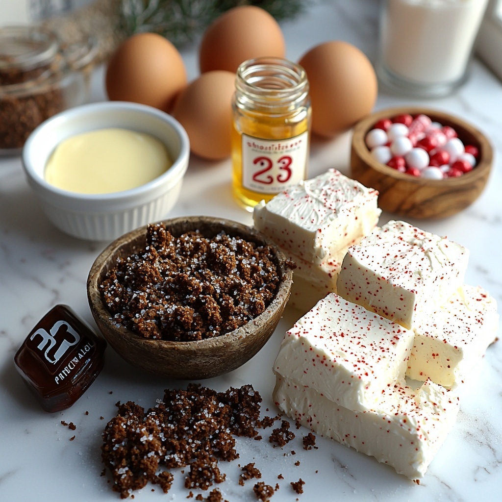 This recipe calls for simple, easy-to-find ingredients that blend beautifully to create a decadent yet balanced dessert. Each component plays a crucial role, from the buttery chocolate crust providing texture and depth, to the peppermint extract and candy giving that unmistakable festive flair.