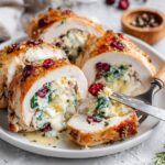 This festive Christmas Stuffed Chicken Breast recipe features tender chicken breasts stuffed with a flavorful combination of cranberry sauce, creamy brie cheese, and sautéed spinach. Perfectly seasoned and oven-baked after a quick sear, this elegant dish offers a delightful balance of savory and sweet, ideal for holiday dinners or special occasions.
