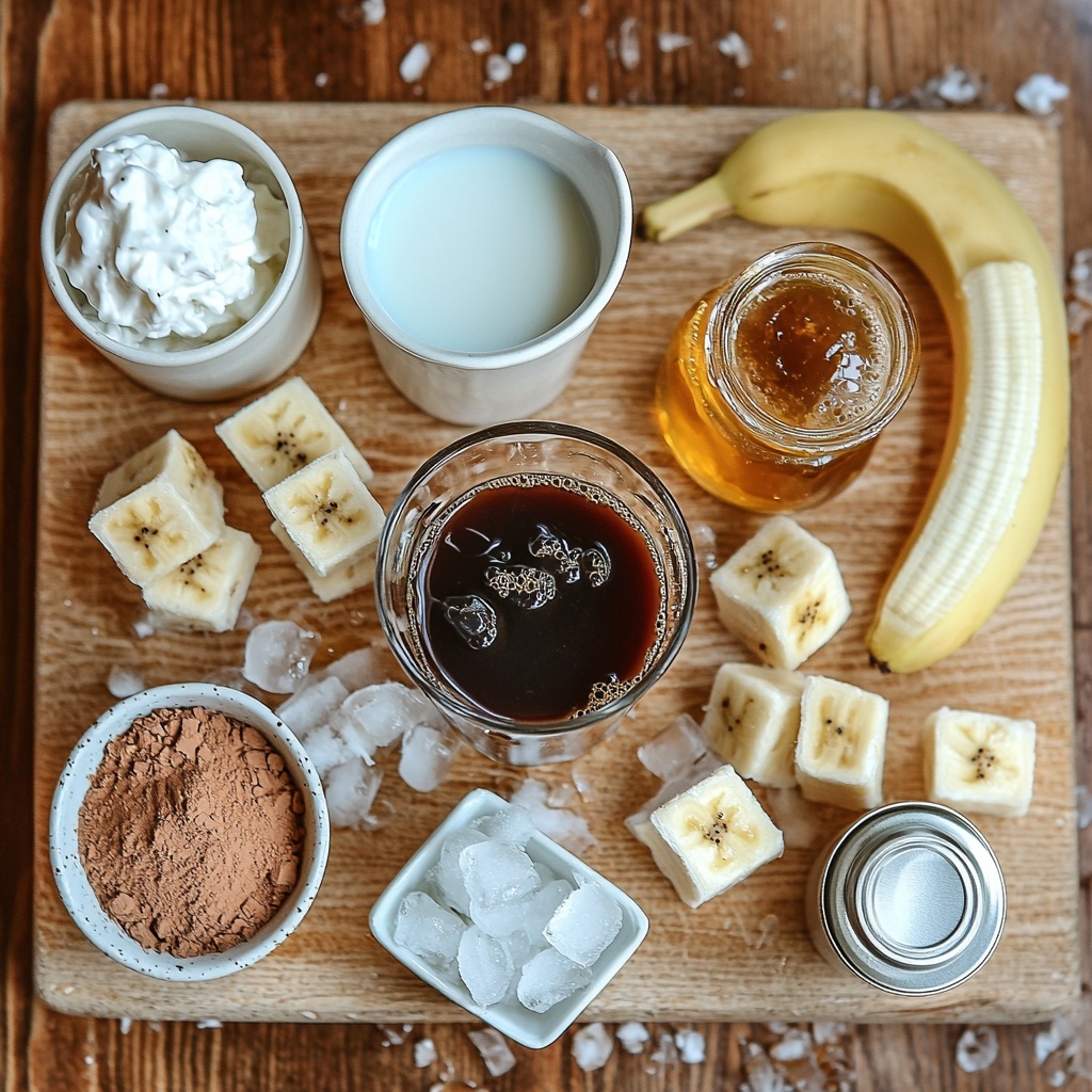 1. Combine Ingredients: Add the cold strong brewed coffee, milk of your choice (whole or almond), frozen banana cubes, honey, cacao powder, and crushed ice cubes into a blender.