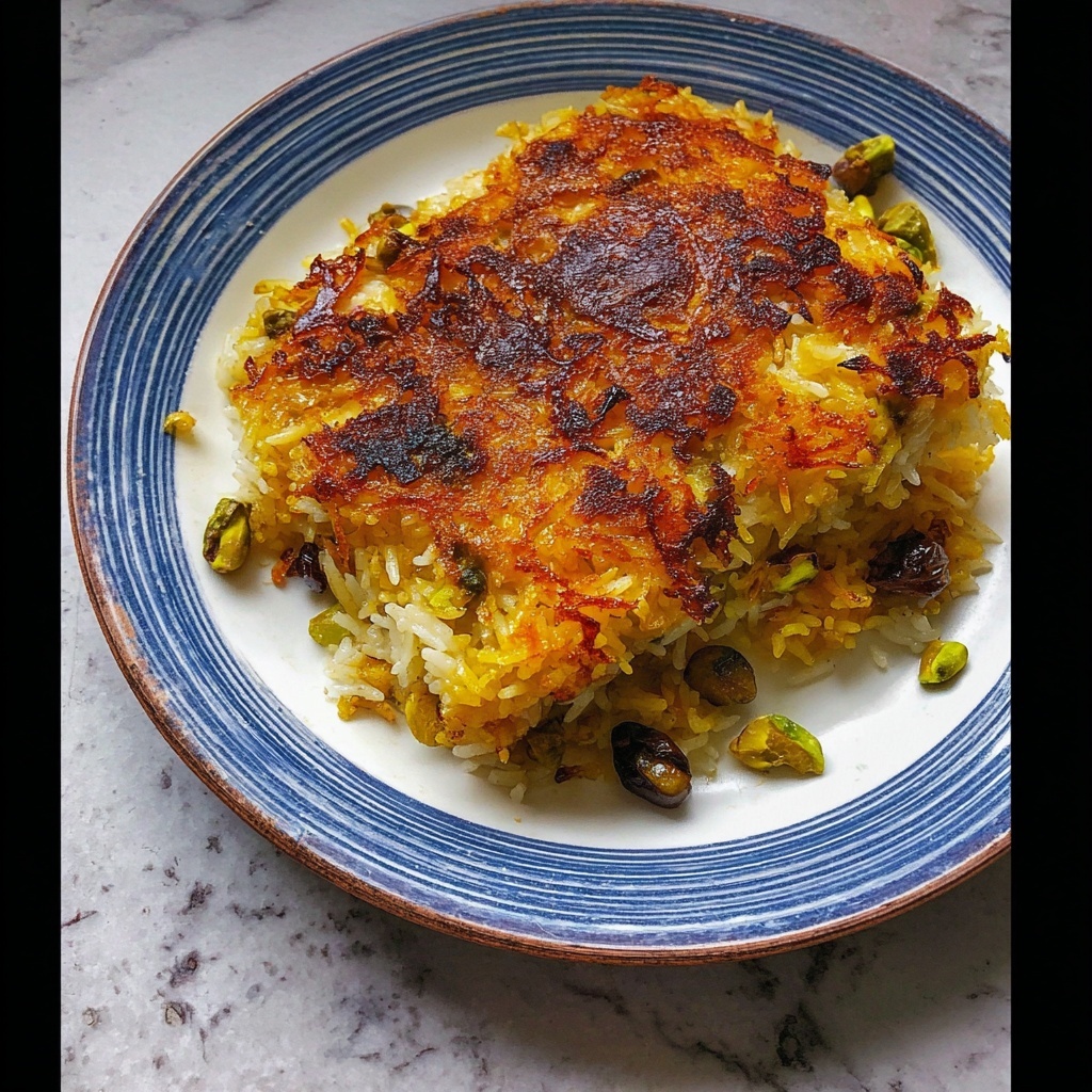 Tahdig is a classic Persian dish featuring crispy, golden rice with layers of flavorful ingredients like saffron, dried cherries, and orange zest. This recipe shows how to create the perfect crispy rice crust combined with aromatic basmati rice, yogurt, and a hint of cinnamon, making it an irresistible side dish or centerpiece for any meal.