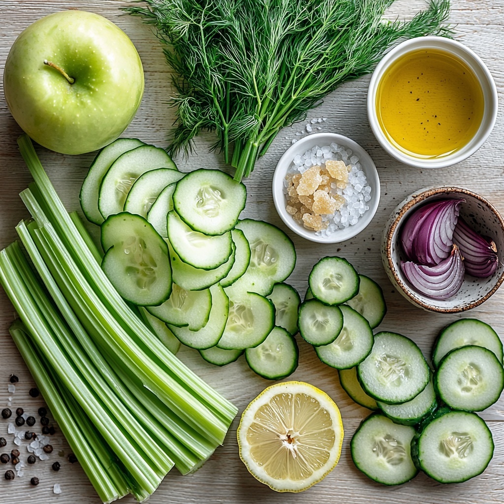 Start by thinly slicing the celery ribs on a bias, this method helps maximize their crunchiness and creates an appealing shape. Next, cut the green apples into thin slices—using Granny Smith gives you that perfect tart punch. Chop the cucumber into precise 1/4-inch half-moons to keep the texture consistent and refreshing. Finally, finely chop the red onion for that subtle pop of sharpness that wakes up the taste buds.
