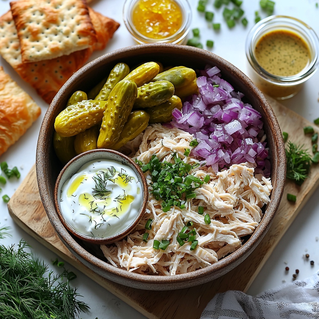Pour your freshly made dressing over the chicken mixture and gently toss until the chicken, pickles, and onion are all evenly coated. This ensures every bite bursts with balanced flavor and delightful texture.