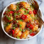 This Easy Sweet Chili Chicken recipe combines tender, bite-sized pieces of chicken thighs or breasts with a flavorful sweet chili sauce, garlic, and ginger. The dish is quickly cooked in a skillet, creating a glossy, savory glaze that’s perfect served over rice or noodles. Garnished with sesame seeds, green onions, and red pepper flakes for an added touch of flavor and texture, this recipe is a simple, delicious weeknight dinner that comes together in just 25 minutes.
