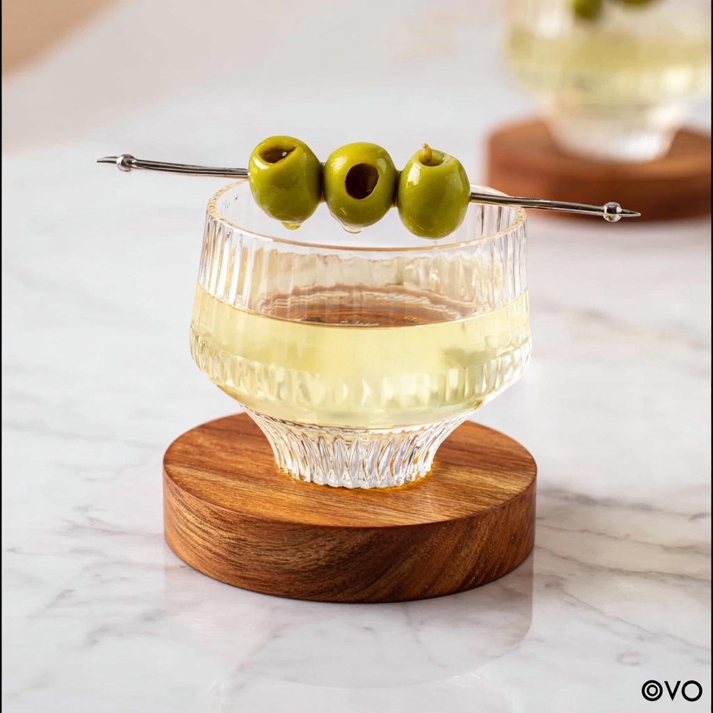 A classic martini glass is ideal for serving this recipe, as its wide, open rim allows you to enjoy the olives and the cocktail’s aroma simultaneously, enhancing the entire drinking experience.