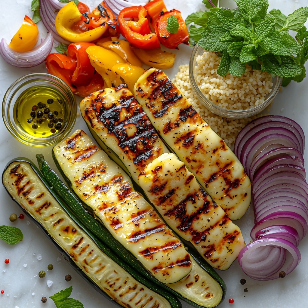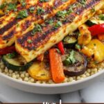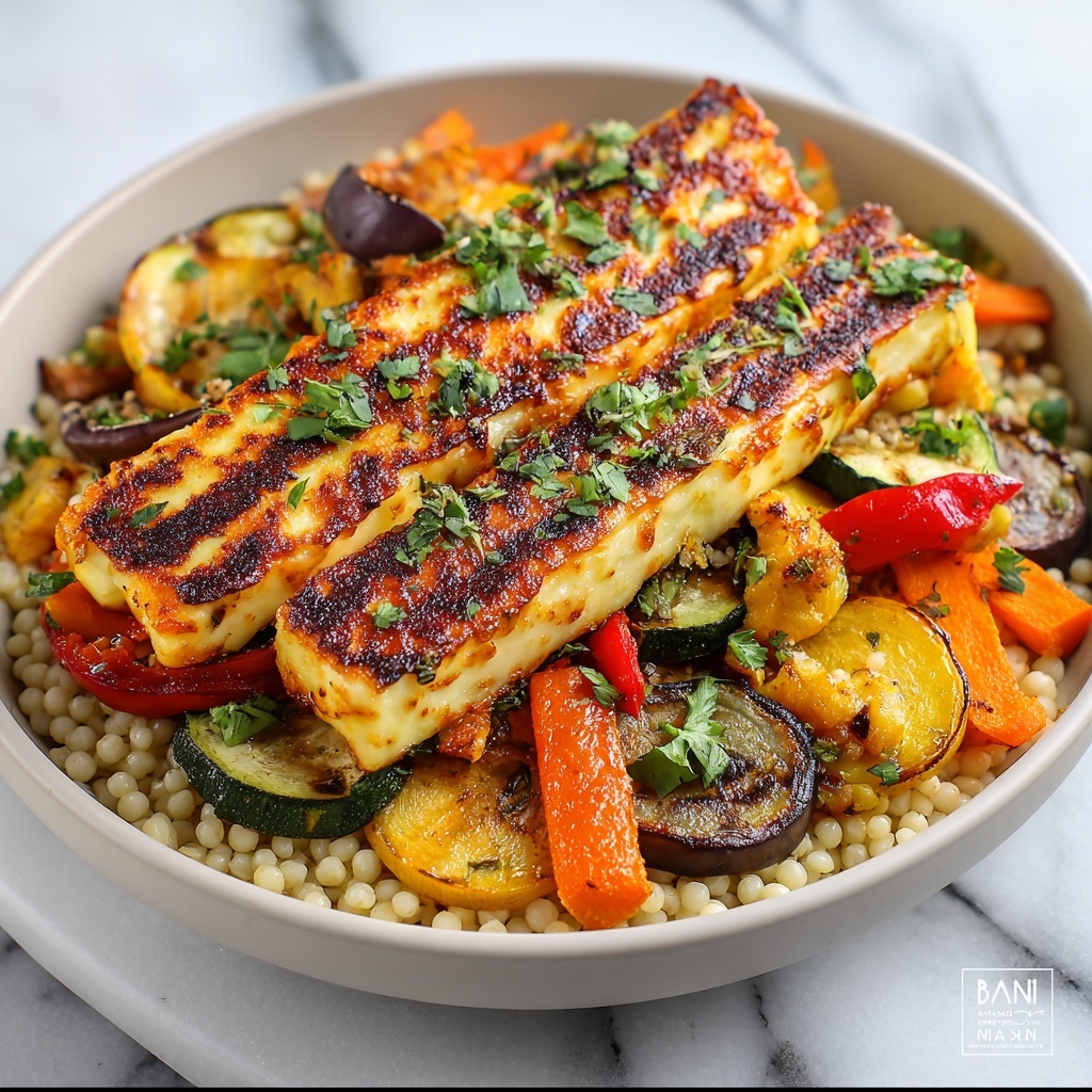 A vibrant and healthy dish featuring griddled seasonal vegetables and golden halloumi cheese served over fluffy, lemon-infused couscous with fresh herbs. Perfect for a quick, flavorful vegetarian meal.