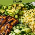 - Assemble the Salad: In a large mixing bowl, combine the cooled orzo, sliced grilled chicken, diced avocado, halved cherry tomatoes, thinly sliced red onion, crumbled feta, and chopped cilantro or parsley. Pour the dressing over and toss gently to combine. Adjust seasoning as needed.