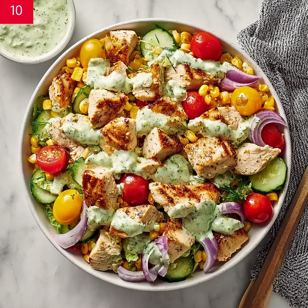 In a large bowl, toss the greens, red onion, cherry tomatoes, cucumber, avocado, and corn together. Add the cooked chicken cubes on top, then drizzle generously with the ranch yogurt dressing. Gently toss once more to combine everything evenly while keeping the avocado intact for creamy texture in every bite.