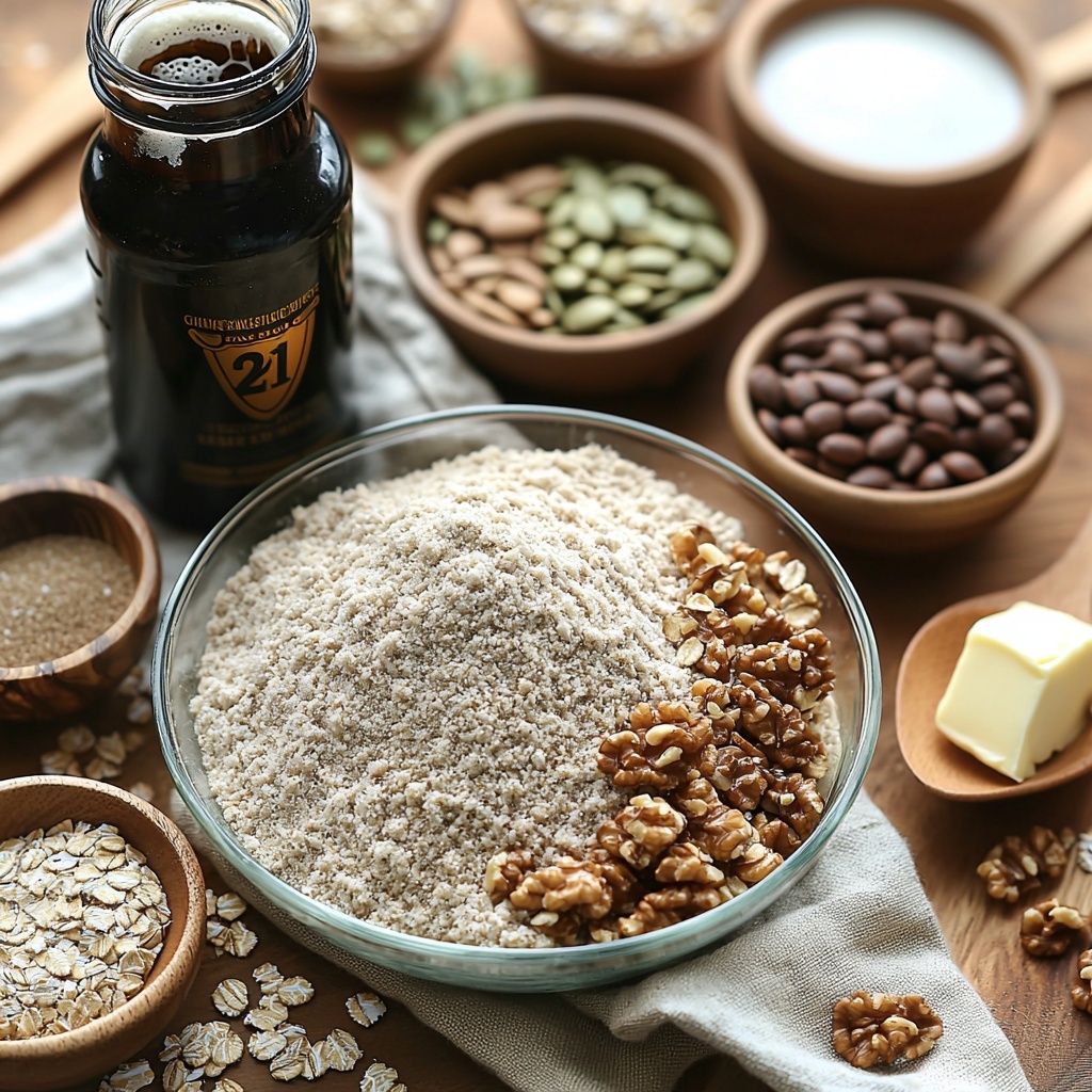 - Mix dry ingredients: In a large bowl, combine the wholewheat flour, baking soda, and sea salt. Stir in the walnuts, rolled oats, sunflower seeds, and pumpkin seeds until evenly distributed.
