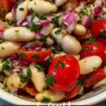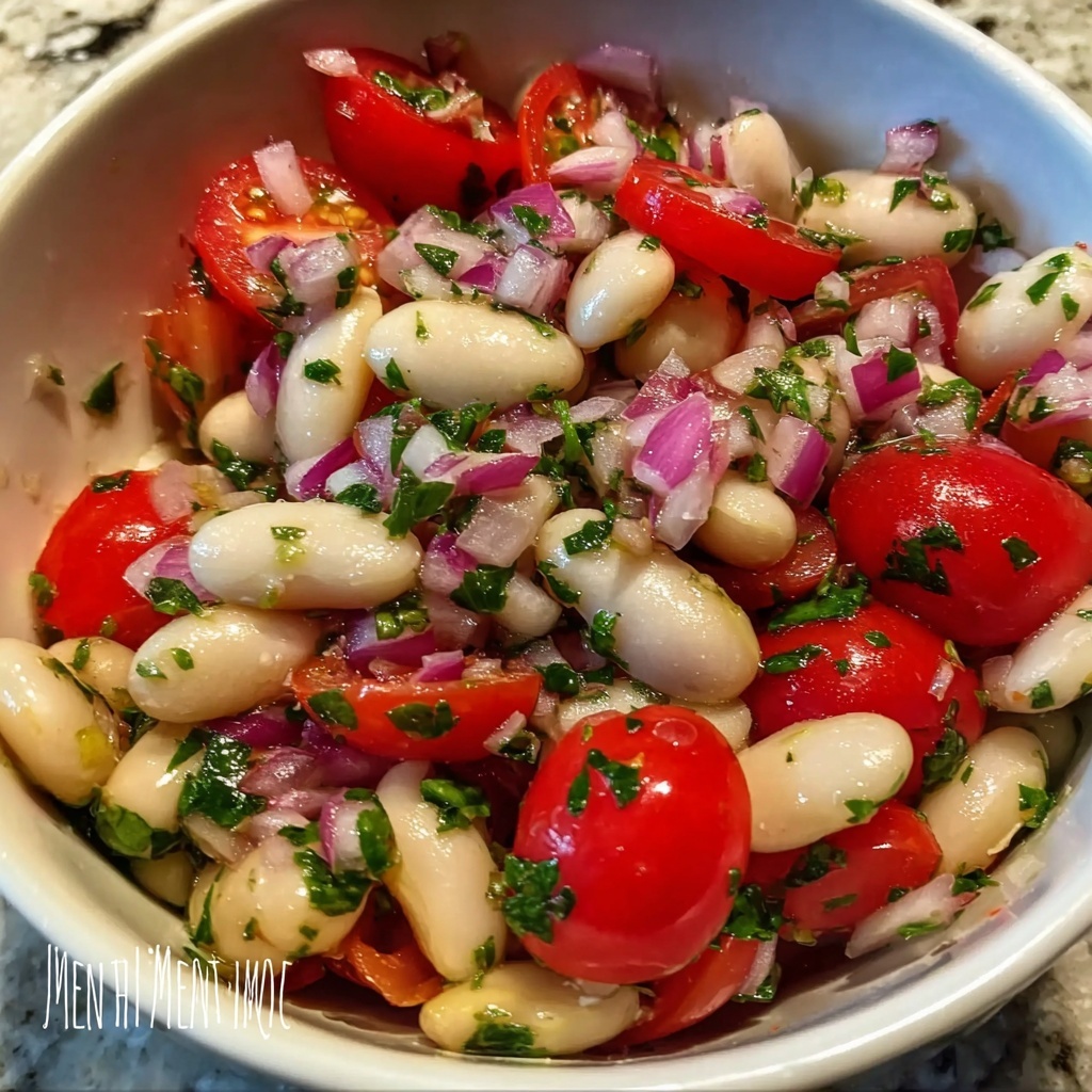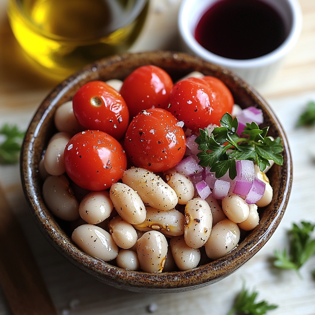 A fresh and vibrant Italian White Bean Salad combining creamy white beans with juicy cherry tomatoes, crisp red onion, and fragrant parsley, dressed in a tangy olive oil and red wine vinegar dressing. This easy-to-make salad is perfect as a light lunch, side dish, or a wholesome snack with rich Mediterranean flavors.