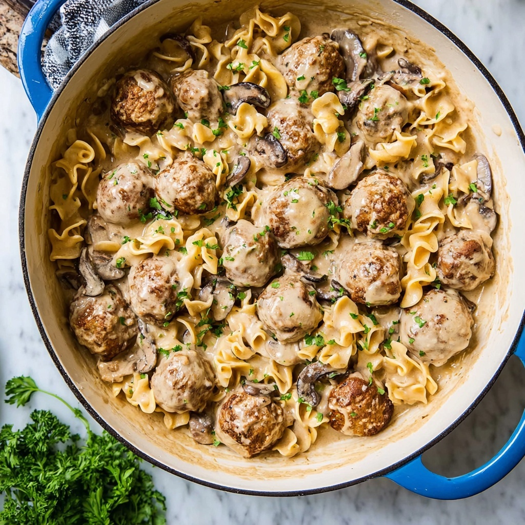 A comforting and creamy Meatball Stroganoff featuring tender meatballs simmered in a rich mushroom and sour cream sauce, served over wide egg noodles. This hearty dish combines the savory flavors of cremini mushrooms, white wine, and a blend of spices for a satisfying family meal ready in just 35 minutes.