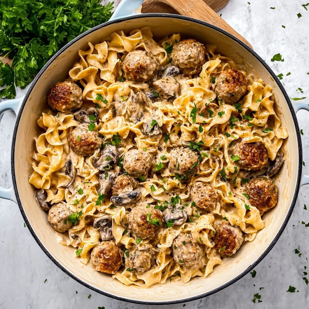 This Meatball Stroganoff recipe combines tender frozen meatballs with a creamy mushroom sauce, enhanced by a splash of white wine and Italian seasonings, served over wide egg noodles for a comforting and hearty meal perfect for weeknights.