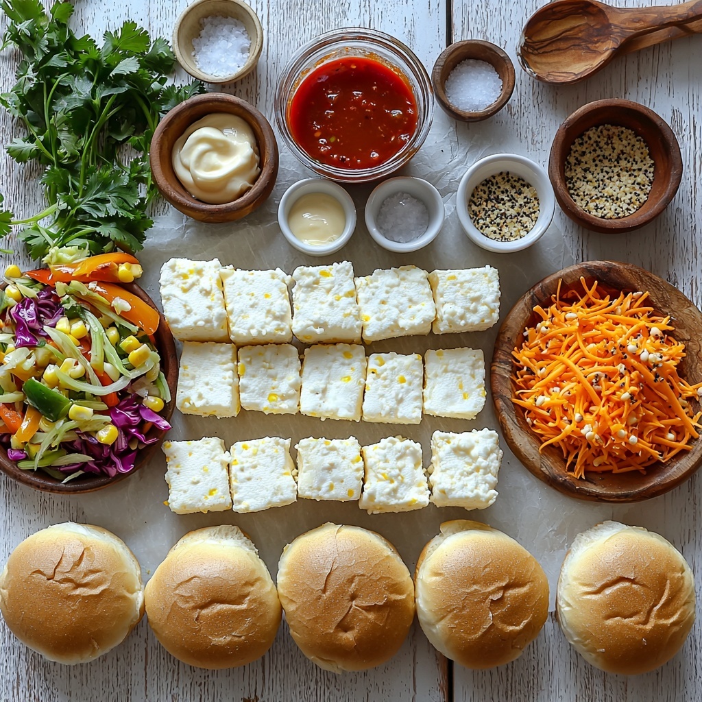 - Assemble the Sliders: On a parchment-lined baking tray, evenly spread the sliced slider buns. On the bottom halves, spread a layer of the spicy mayonnaise mixture. Add a generous handful of shredded slaw, then a healthy scoop of the paneer and corn filling. Sprinkle the mixed cheese on top. Spread coriander chutney on the top halves of the buns.
