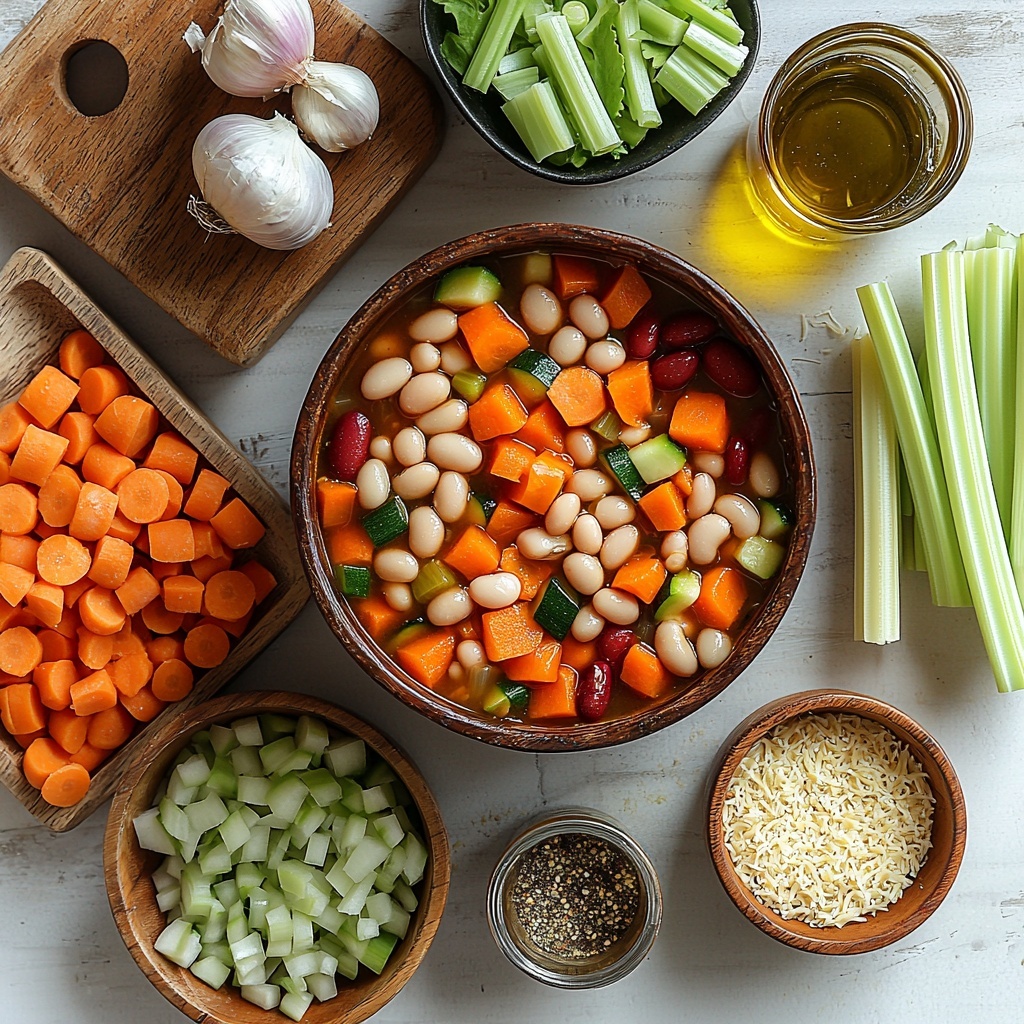 Getting the ingredients together for this soup is delightfully straightforward, and each item plays a crucial role to build layers of flavor, color, and texture. From crisp veggies to tender pasta and hearty beans, all simple, approachable kitchen staples come together brilliantly in this recipe.