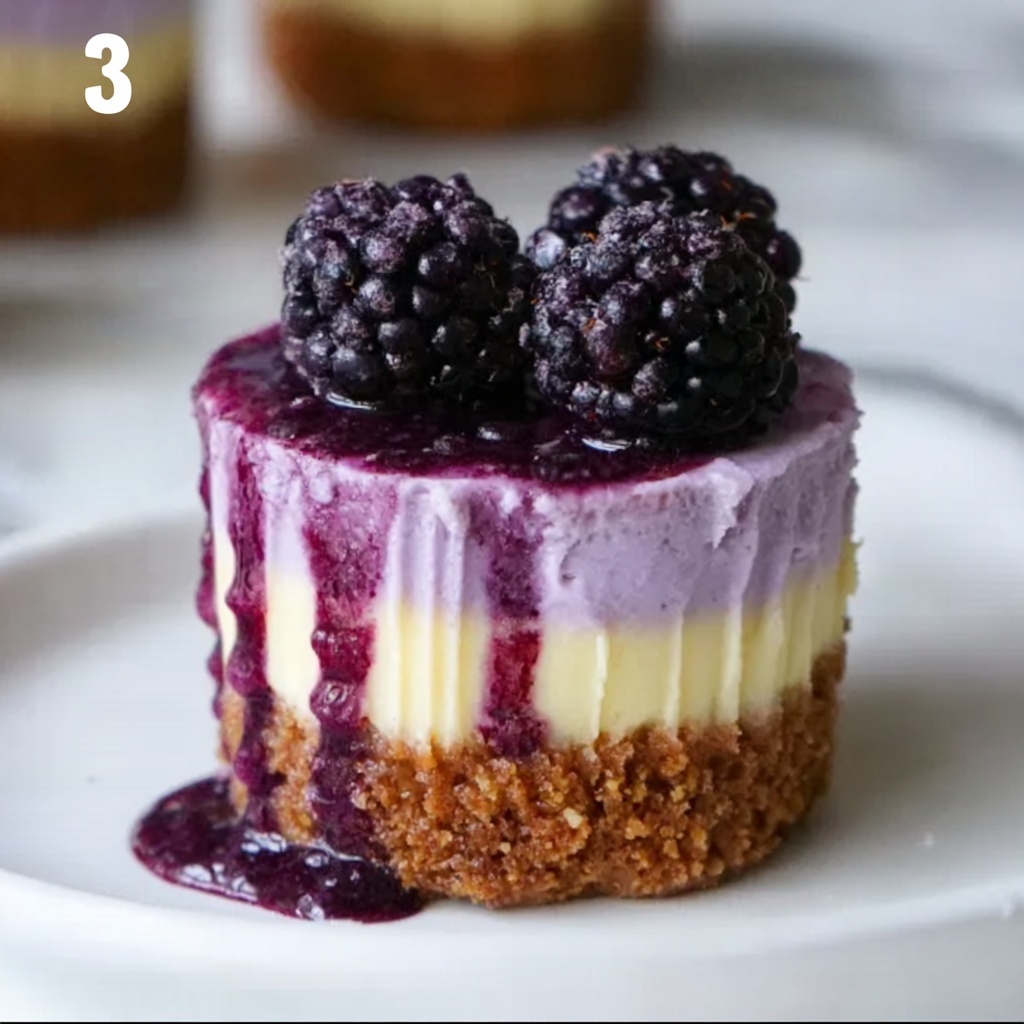 - Top with Blackberry Sauce: Once cooled, spoon the prepared blackberry topping evenly over each cheesecake, creating a beautiful glossy layer.