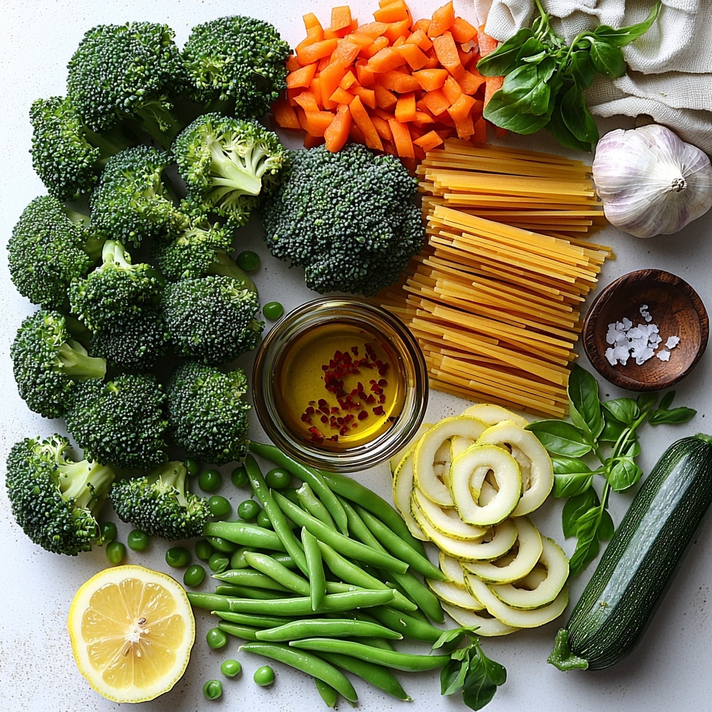 Start by chopping and slicing all the vegetables into uniform pieces to ensure they cook evenly. Get a large pot of salted water boiling—this will be your multitasking base for blanching veggies and cooking pasta, making cleanup a breeze.