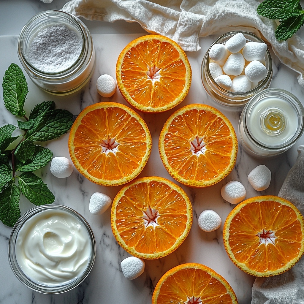 A refreshing and creamy Orange Dreamsicle Salad combining juicy sliced oranges with a fluffy whipped cream and vanilla yogurt mixture, sweetened with powdered sugar and enhanced with orange extract. Mini marshmallows add a delightful texture, making this chilled fruit salad a perfect dessert or side dish for any occasion.