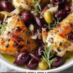 A flavorful and easy pan-roasted chicken recipe featuring juicy grapes and briny olives. This dish combines crispy-skinned chicken thighs with softened onions, garlic, and aromatic thyme, finished in the oven for a tender, juicy meal with vibrant Mediterranean-inspired flavors. Perfect for a comforting yet elegant dinner.