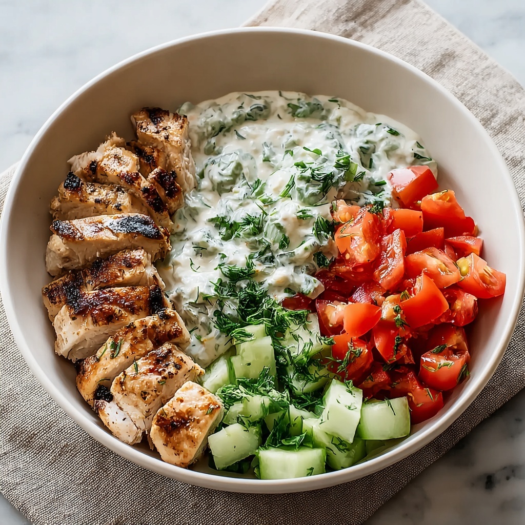 These Refreshing Chicken Tzatziki Bowls offer a vibrant and healthy Mediterranean-inspired meal featuring marinated grilled chicken, creamy homemade tzatziki, fresh vegetables, and grains like quinoa or couscous. Perfect for a light lunch or dinner, this recipe combines bright lemony flavors and aromatic herbs for a satisfying and wholesome feast.