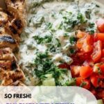 Spoon a generous amount of the chilled tzatziki over the chicken and veggies. Then sprinkle with crumbled feta cheese, which adds a salty creaminess that perfectly balances the fresh ingredients. Garnish with fresh dill or parsley for an aromatic finish.