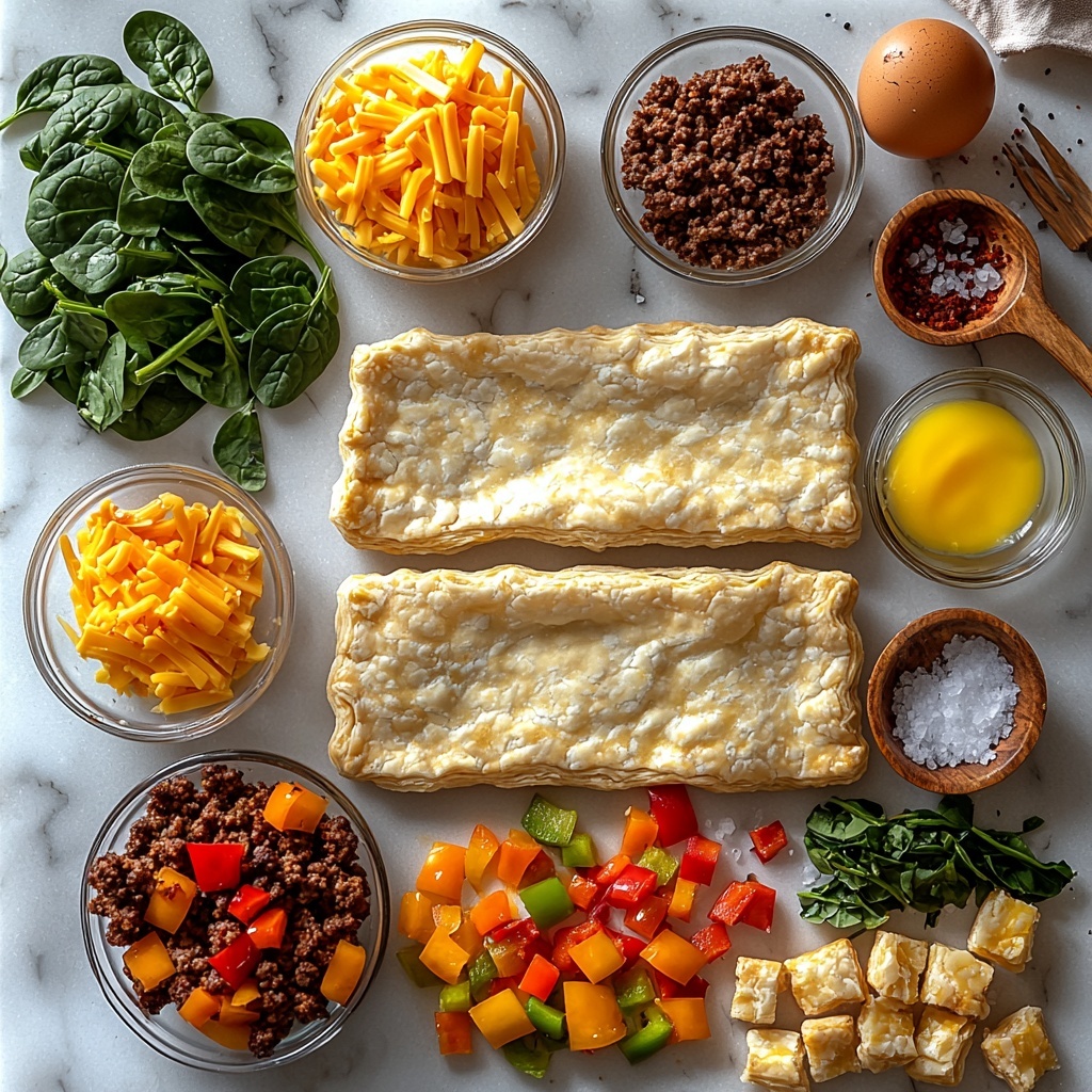 Start by cooking your chosen protein—either lean ground beef or a vegetarian breakfast sausage—until fully cooked and nicely browned. Drain any excess fat and let it cool so it doesn’t turn the pastry soggy. While the meat cools, scramble your eggs gently until they are just set; you want them soft but not dry. Next, sauté your diced bell peppers, minced onion, and spinach until tender and all moisture has evaporated to prevent sogginess later. Once cooled, combine the scrambled eggs, cooked meat, cheese, and vegetables in a bowl, seasoning with salt, pepper, garlic, and onion powder. Mix everything just enough to unify the flavors without mashing the texture.