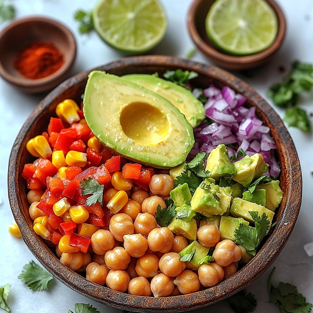 Start by tossing together the chickpeas, corn, red bell pepper, red onion, avocado, and cilantro in a large bowl. This is where the magic begins — you’re building a colorful, flavorful base that’s bursting with texture. Make sure your chickpeas are well-drained and rinsed to avoid sogginess.