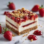 - Finish with Toppings: Spoon the cooled strawberry sauce over each cheesecake chunk, then generously sprinkle the strawberry crunch topping on top. Drizzle melted white chocolate over the chunks in a zigzag pattern and add extra strawberry crunch for added texture and visual appeal.