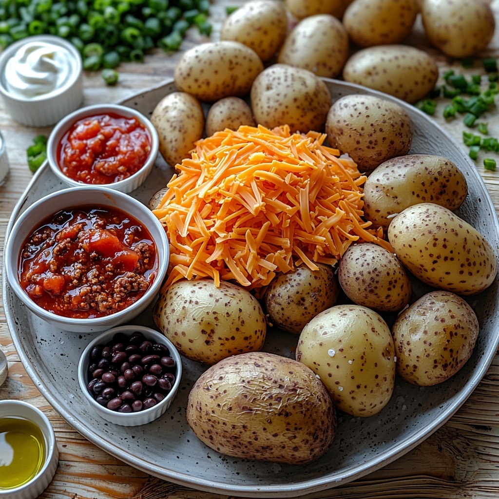 • 4 medium russet potatoes: These are ideal for baking because of their fluffy interiors that soak up all the delicious toppings.