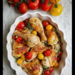 When you’re ready to cook, preheat your oven to 300°F. Nestle the cherry tomatoes between the chicken legs in the baking dish, then pour the olive oil over everything, making sure the chicken is mostly submerged. Slowly cook it for about 2 hours — this gentle process renders the fat and infuses the chicken with garlicky, herbal richness while allowing the tomatoes to soften and release their sweet juices. You’ll end up with chicken that practically melts in your mouth.