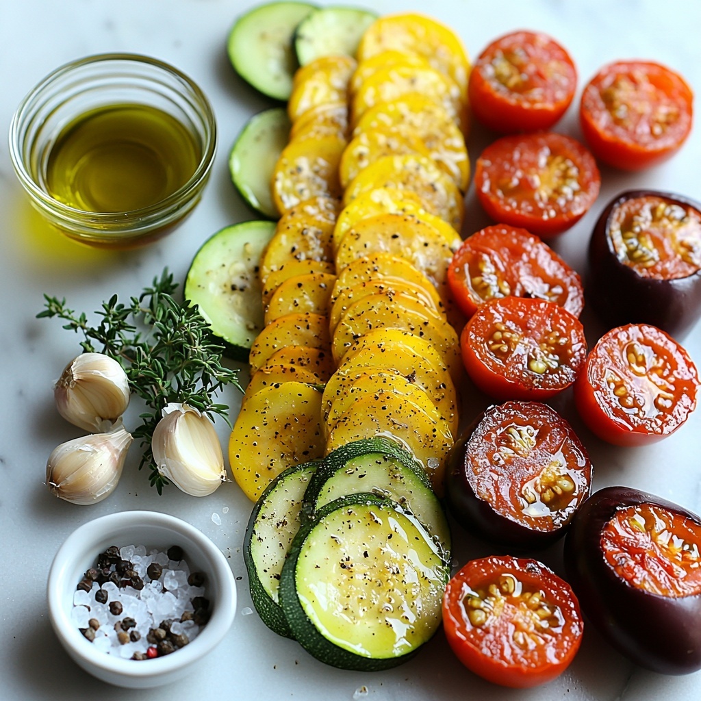 - Arrange the vegetables: In a circular baking dish, arrange the zucchini, yellow squash, eggplant, and tomato slices in an overlapping pattern to create an attractive layered look.