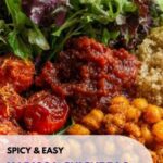 This vibrant and flavorful recipe features spicy harissa chickpeas roasted to crispy perfection, served over a bed of cooked quinoa and mixed greens. Topped with juicy cherry tomatoes, creamy feta (optional), and fresh herbs, it makes a perfect, healthy Superbowl snack or a light meal that’s both easy to prepare and packed with bold flavors.